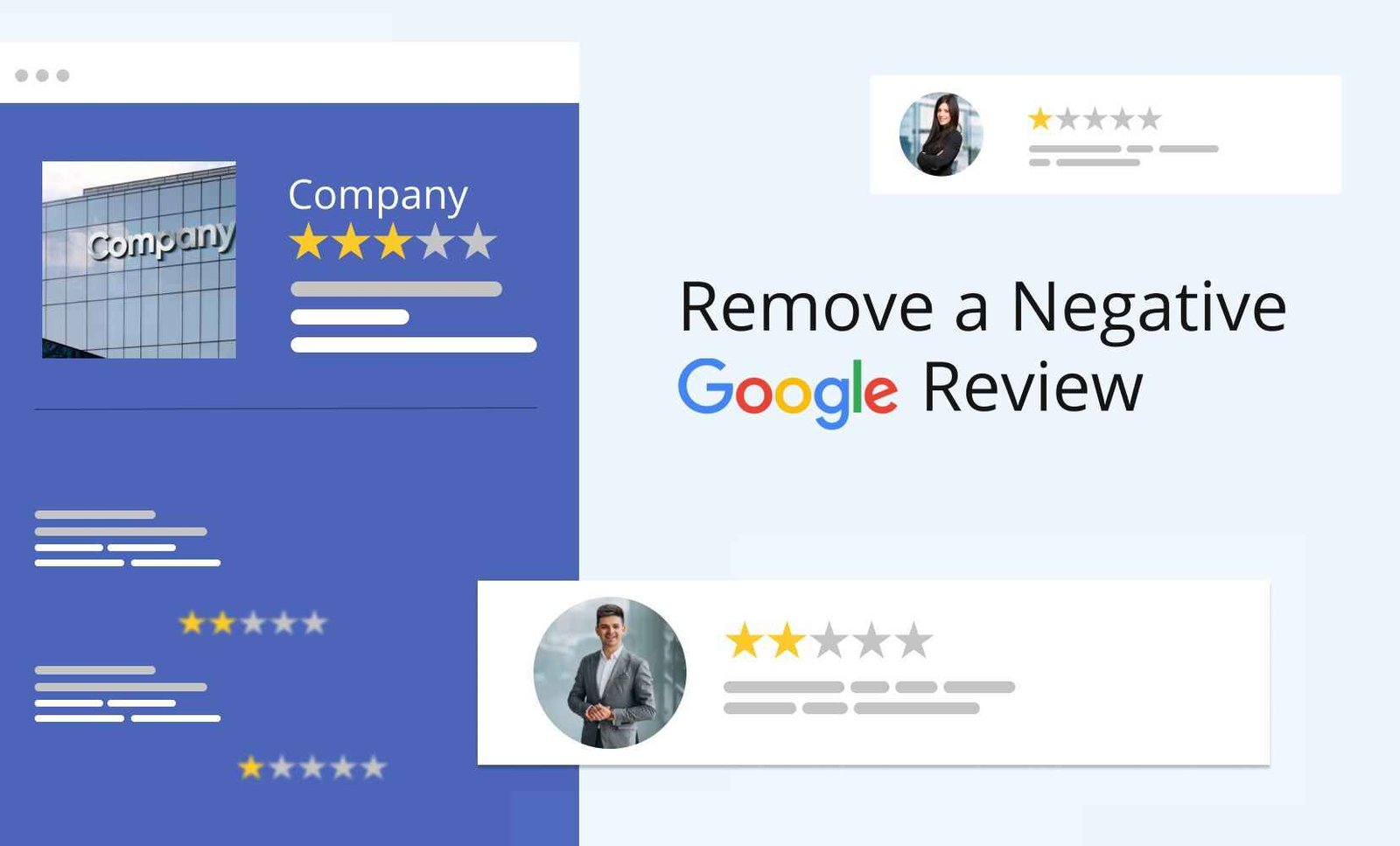 We begin by conducting a comprehensive audit of your business reviews on Google and other key platforms. This identifies which reviews can be directly challenged, suppressed, or removed.